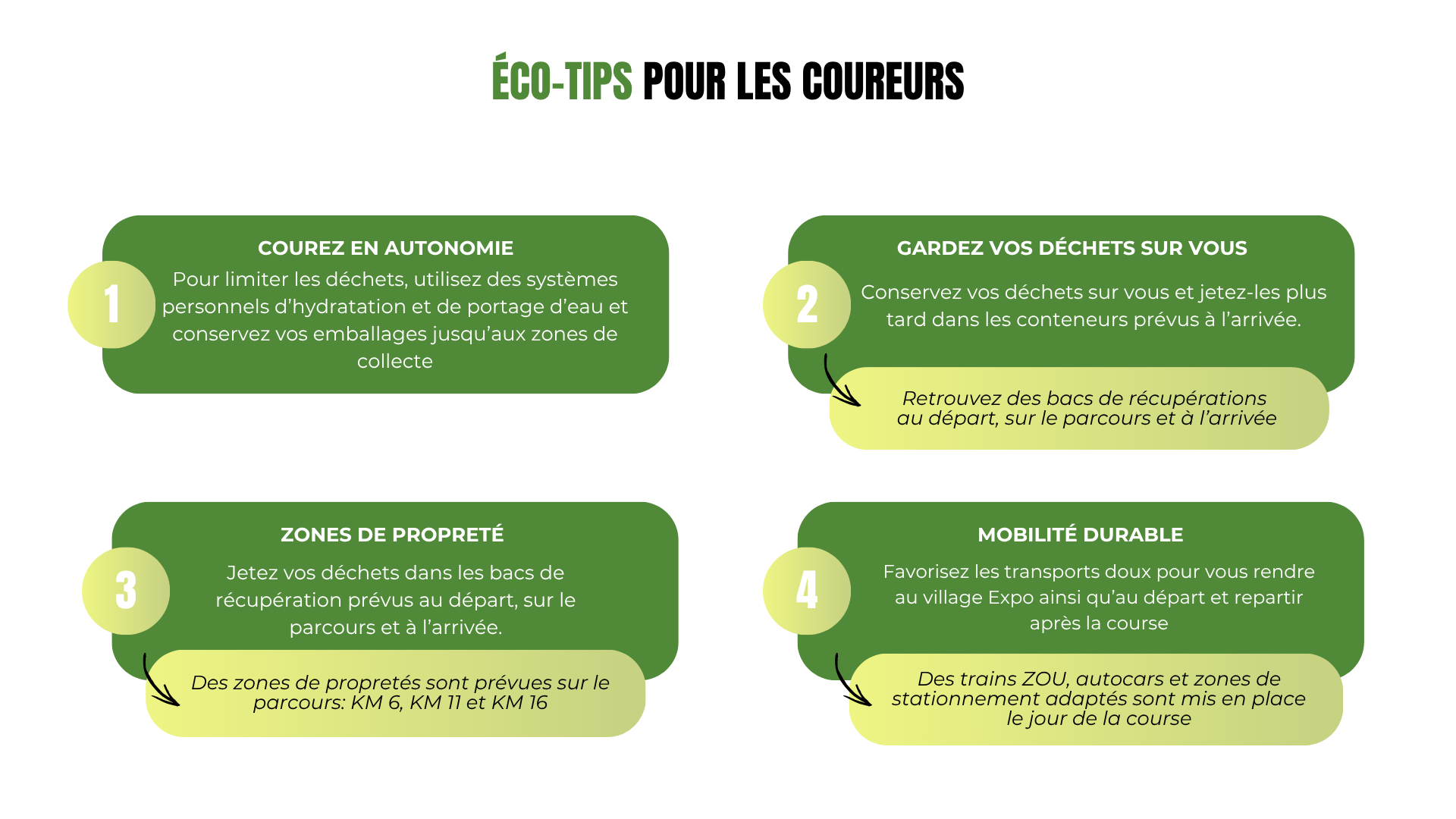 En renfort des bénévoles mobilisés sur les points de ravitaillement, l’organisation fait également appel à l’association AVIE, engagée en faveur de l’environnement, qui assure un ramassage complémentaire des bouteilles et déchets sur le parcours.